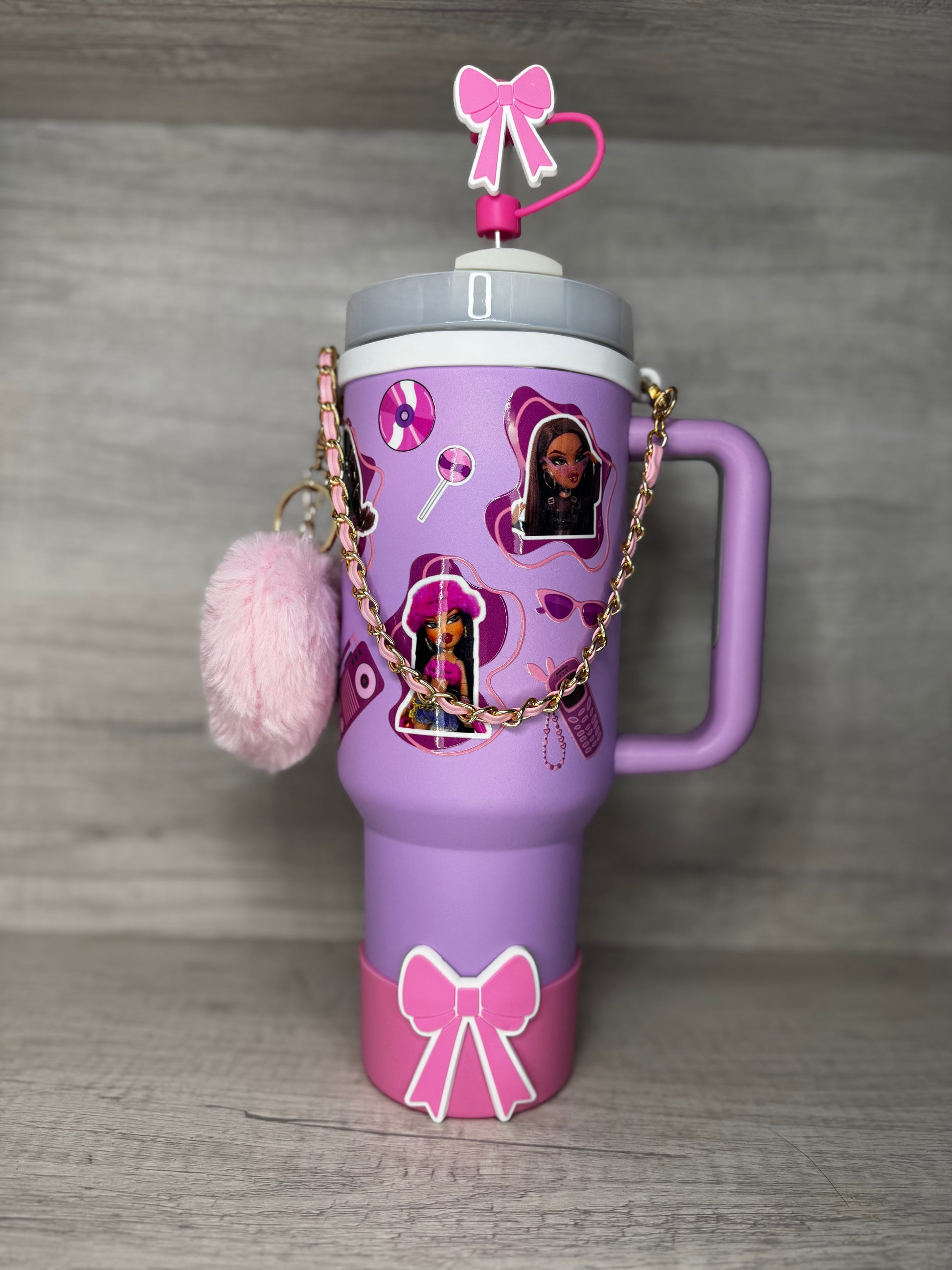 Vaso color púrpura con diseño inspirado en Bratz, decorado con detalles llamativos que reflejan un estilo atrevido, femenino y lleno de personalidad. Ideal para quienes aman lo glam y lo trendy.